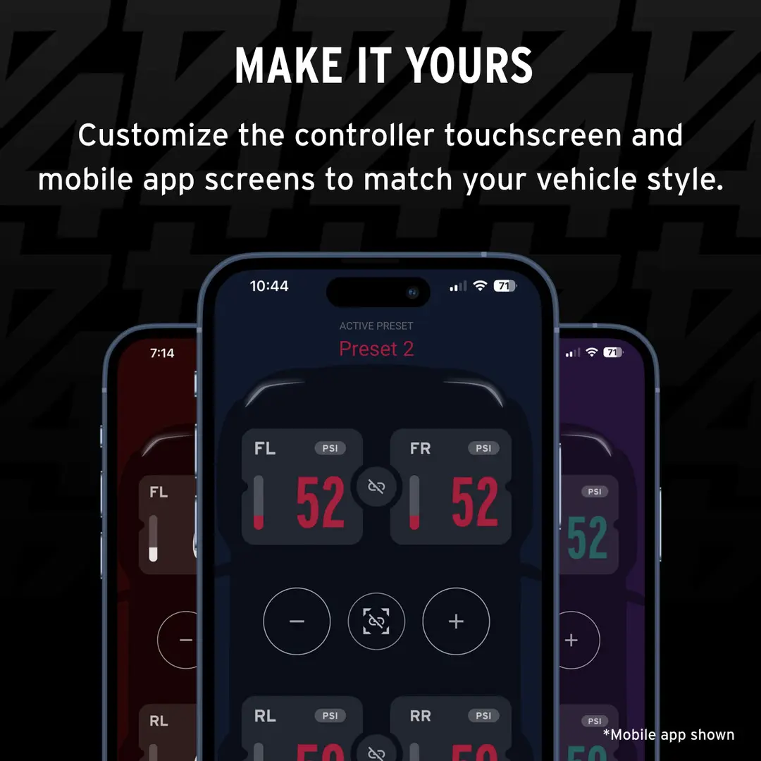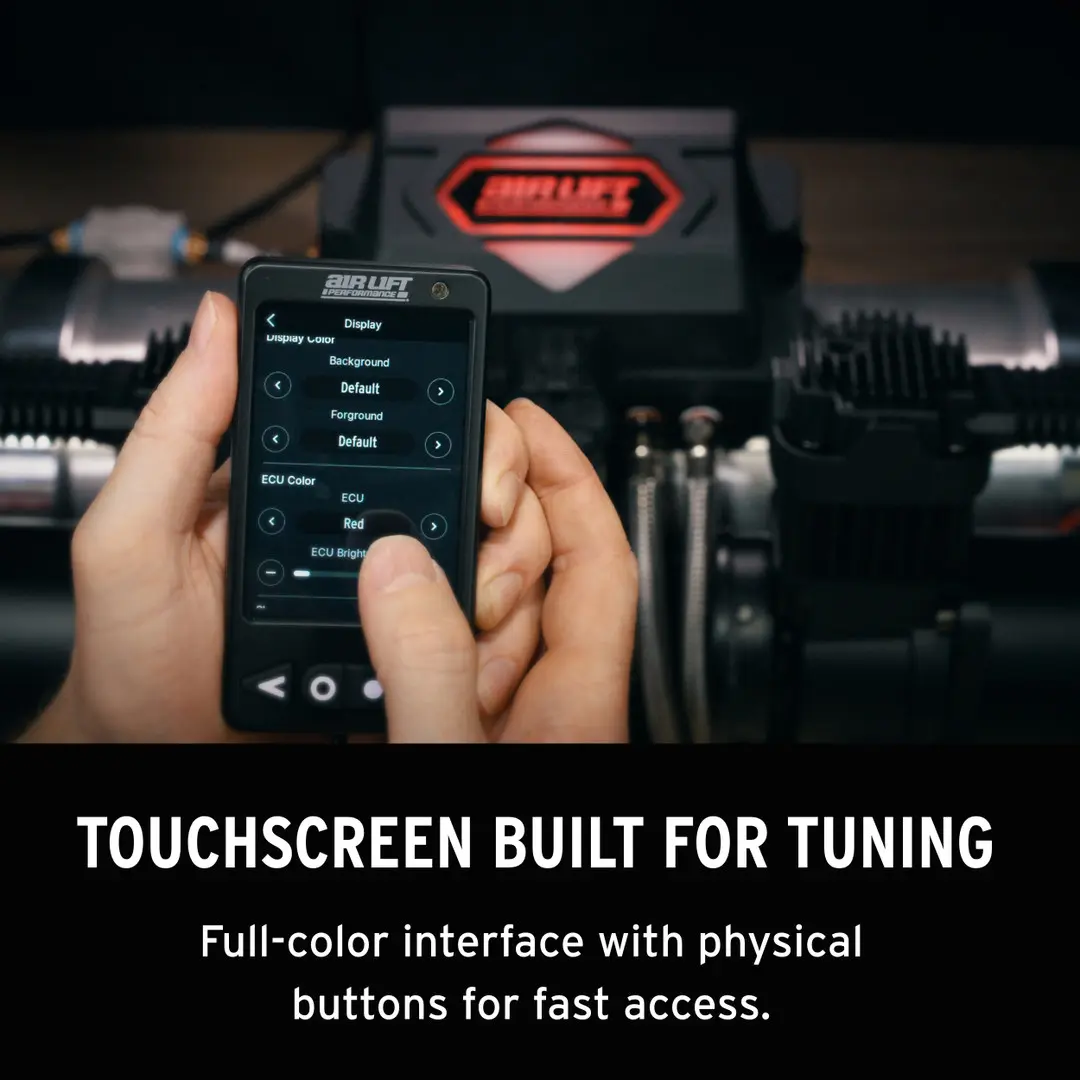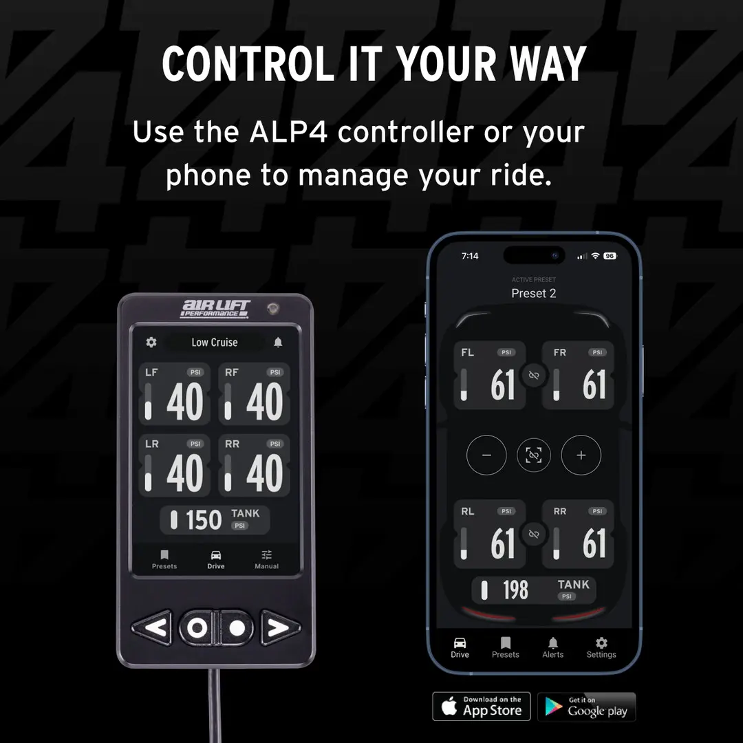 The ALP4 air management system redefines what’s possible for air suspension control, combining cutting-edge hardware with smarter, more seamless functionality. This system features a compact, all-in-one manifold, which houses the ECU, solenoids, and pressure sensors, crafted from anodized black billet aluminum for durability and a sleek, show-ready appearance. Paired with a full-color touchscreen controller framed in anodized aluminum and equipped with four tactile physical buttons, this system offers immediate control for your presets, 4-corner manual control, axle adjustments, full air-out and other adjustable functions. With mobile app integration, ALP4 allows you to use and fine-tune your setup from anywhere, ensuring ultimate control.