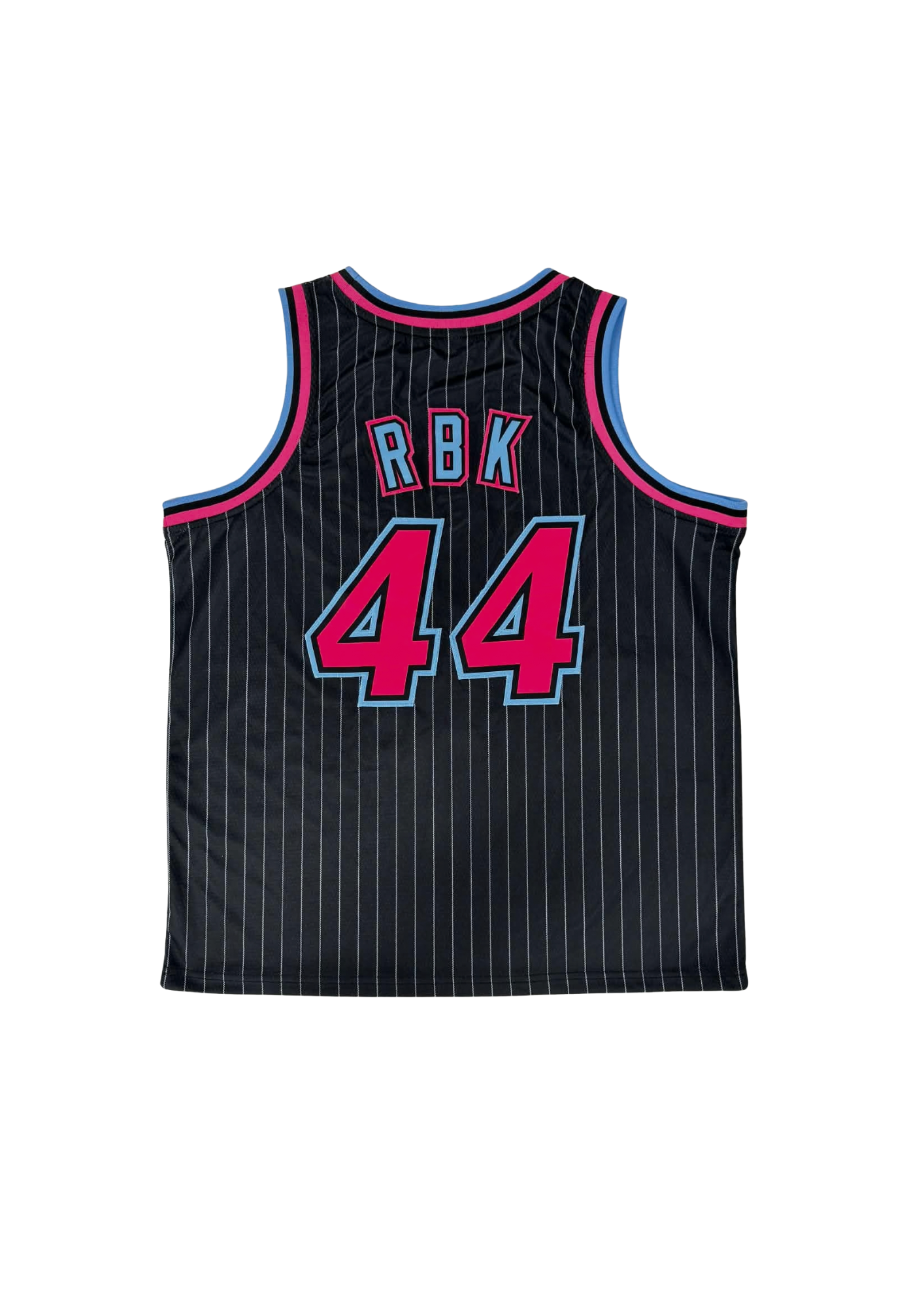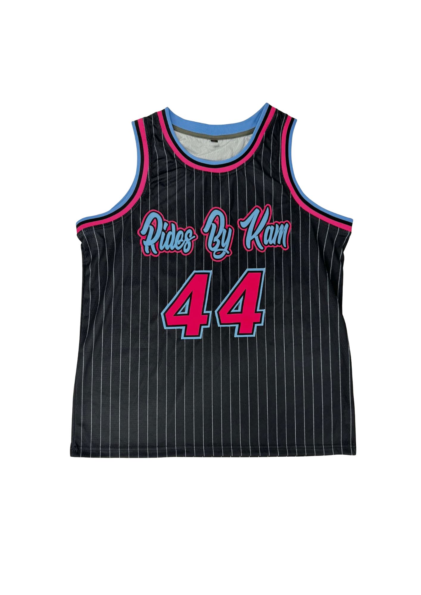 Designed with a sleek black base and subtle vertical pinstripes, this jersey features eye-catching pink and blue accents along the trim and lettering. The signature Rides By Kam script across the chest brings unmistakable identity, while the striking 44 front graphic makes a confident statement.